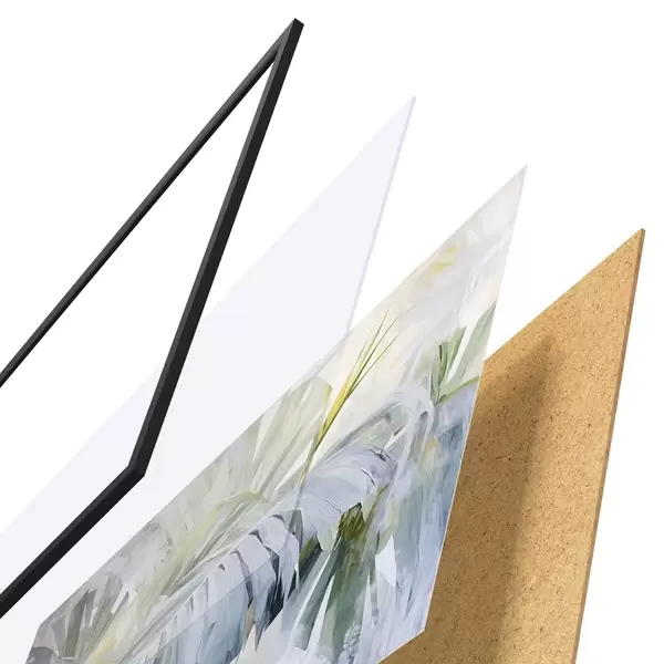 El póster consta de marco, plexiglás, imagen impresa y soporte de aglomerado. El póster puede colgarse inmediatamente en la pared gracias a los soportes de la parte posterior.
