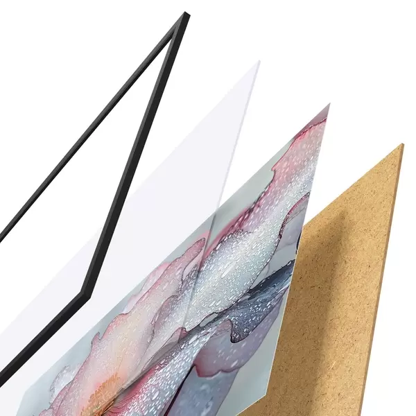 El póster consta de marco, plexiglás, imagen impresa y soporte de aglomerado. El póster puede colgarse inmediatamente en la pared gracias a los soportes de la parte posterior.
