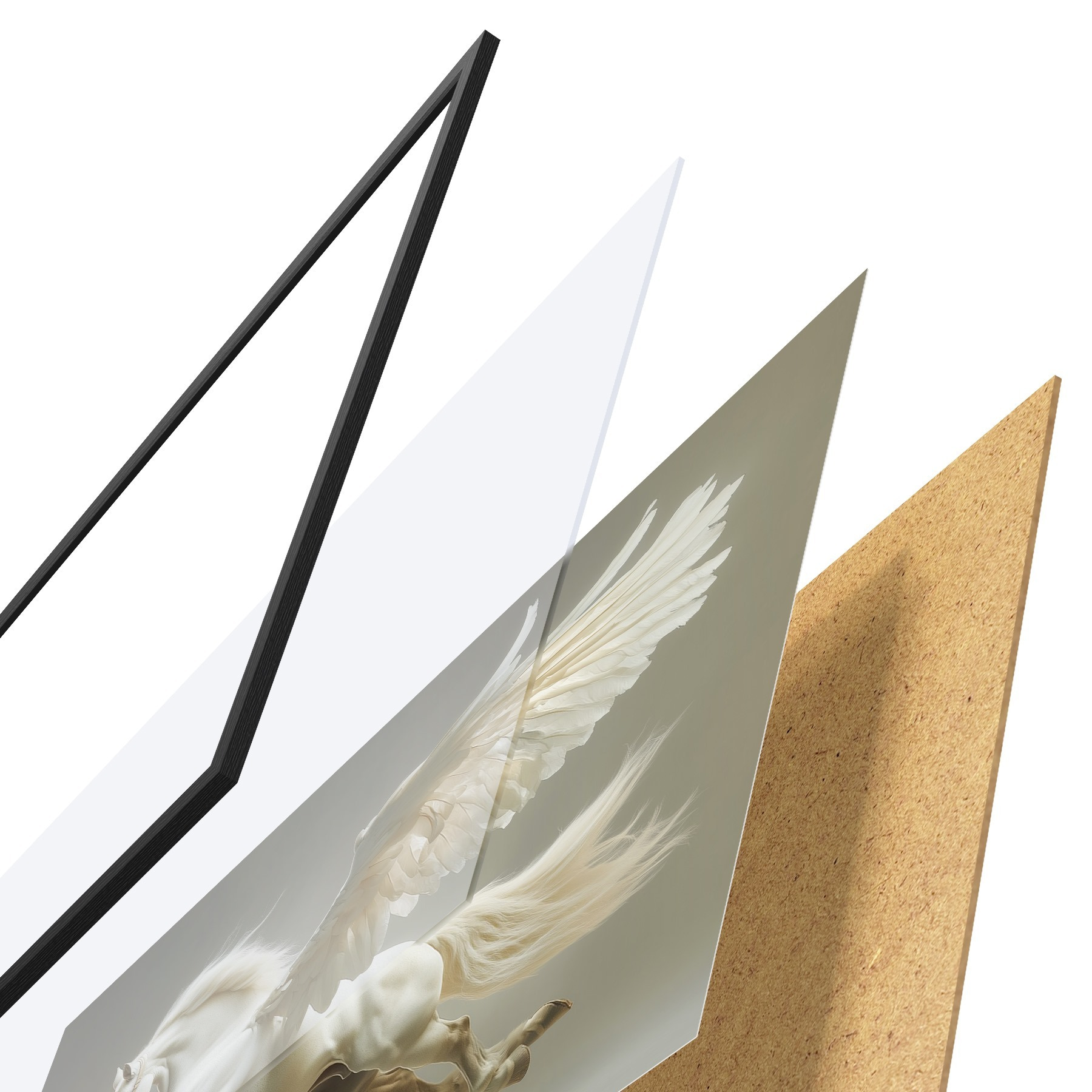 El póster consta de marco, plexiglás, imagen impresa y soporte de aglomerado. El póster puede colgarse inmediatamente en la pared gracias a los soportes de la parte posterior.