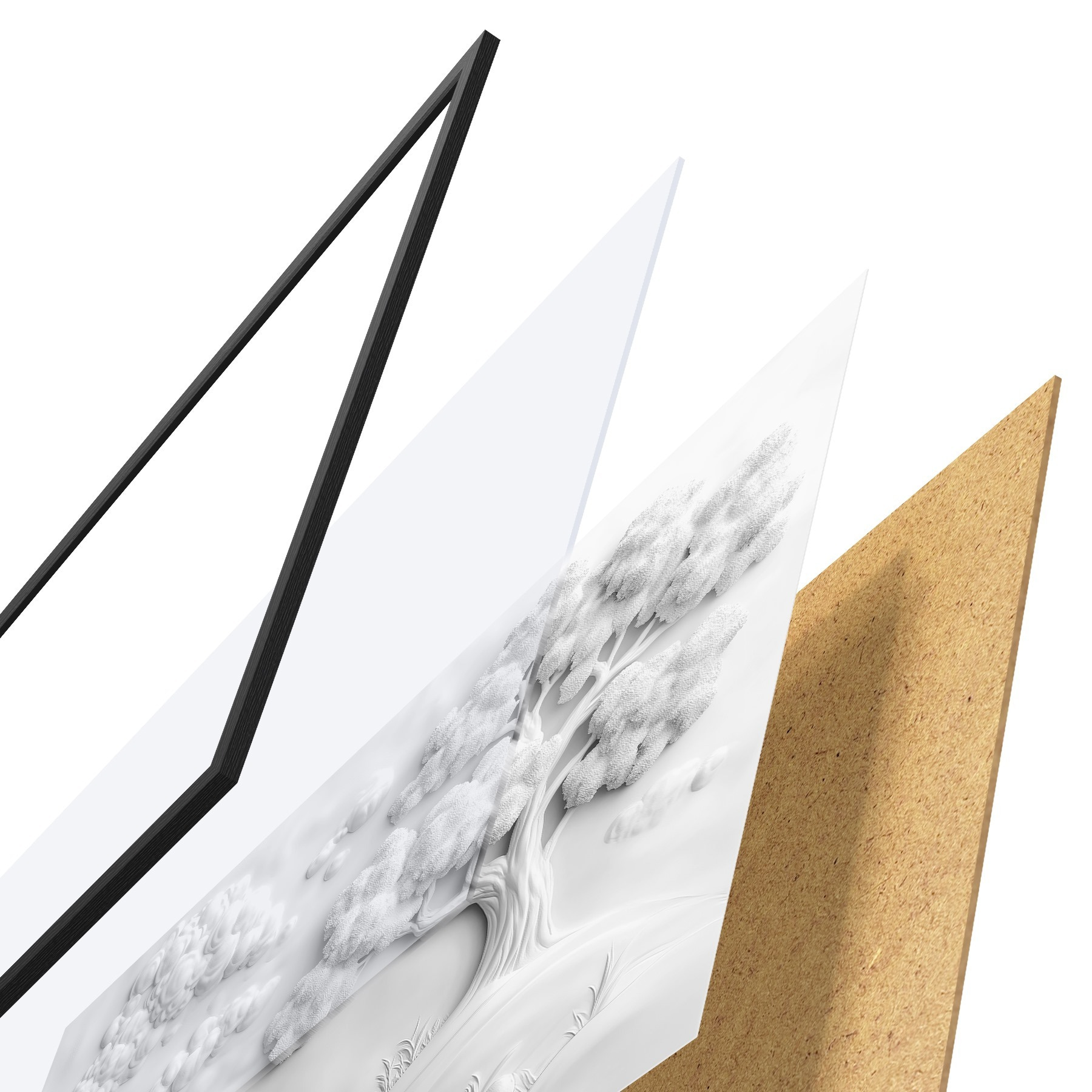 El póster consta de marco, plexiglás, imagen impresa y soporte de aglomerado. El póster puede colgarse inmediatamente en la pared gracias a los soportes de la parte posterior.