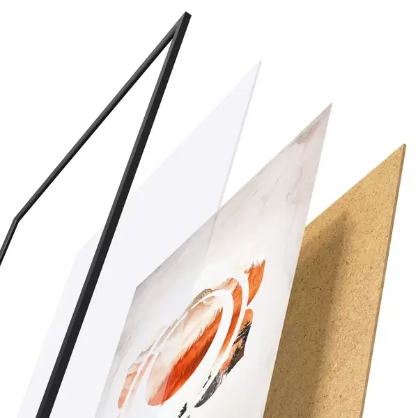 El póster consta de marco, plexiglás, imagen impresa y soporte de aglomerado. El póster puede colgarse inmediatamente en la pared gracias a los soportes de la parte posterior.