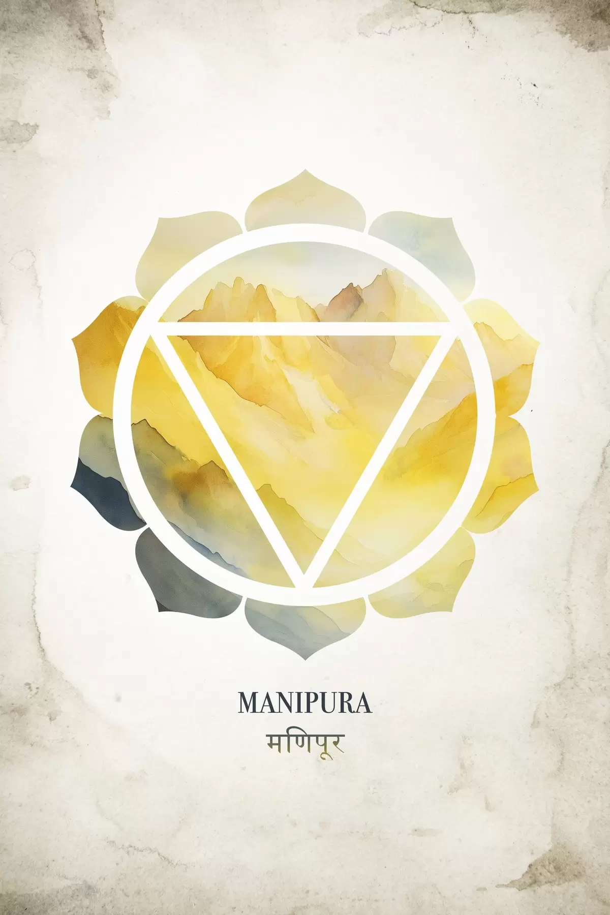 Poster Manipura chakra, chakra amarillo, esotérico, meditación, budismo, montañas estilo acuarela f41882