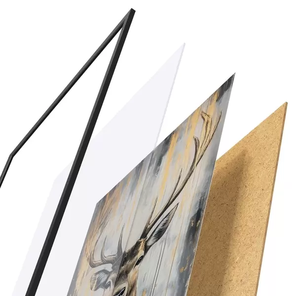 El póster consta de marco, plexiglás, imagen impresa y soporte de aglomerado. El póster puede colgarse inmediatamente en la pared gracias a los soportes de la parte posterior.