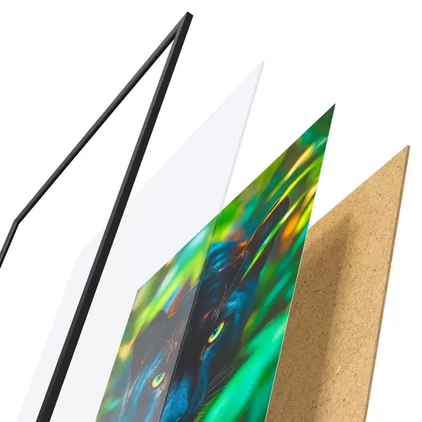 El póster consta de marco, plexiglás, imagen impresa y soporte de aglomerado. El póster puede colgarse inmediatamente en la pared gracias a los soportes de la parte posterior.
