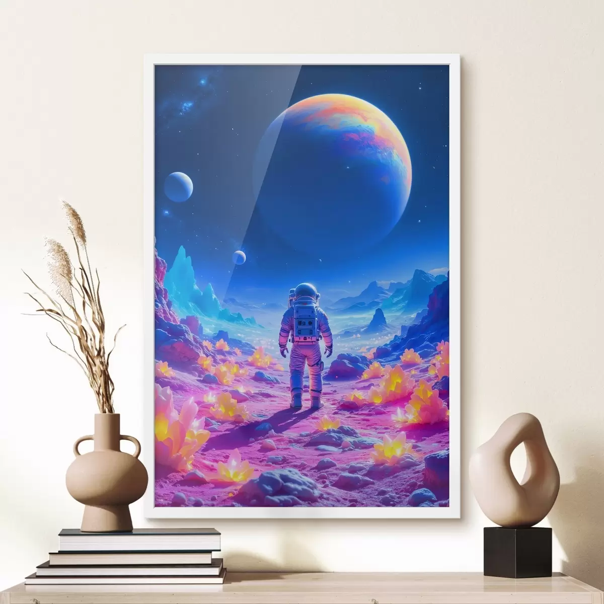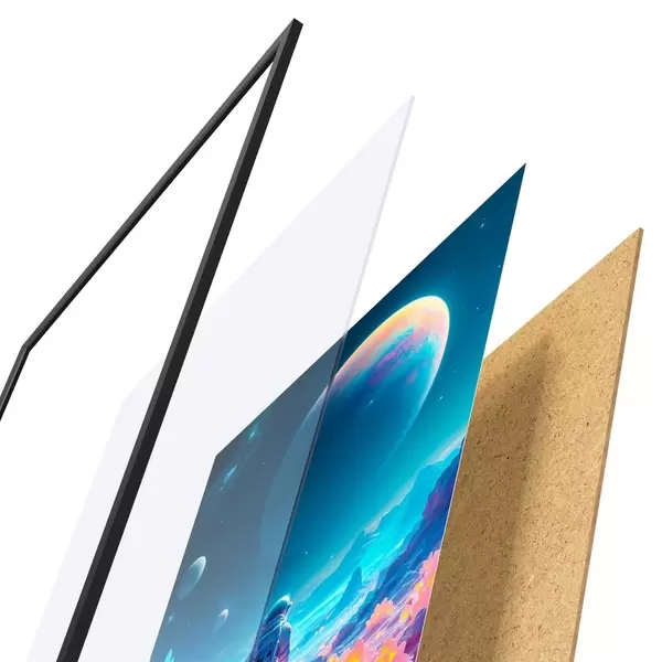 El póster consta de marco, plexiglás, imagen impresa y soporte de aglomerado. El póster puede colgarse inmediatamente en la pared gracias a los soportes de la parte posterior.