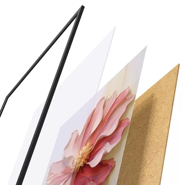 El póster consta de marco, plexiglás, imagen impresa y soporte de aglomerado. El póster puede colgarse inmediatamente en la pared gracias a los soportes de la parte posterior.