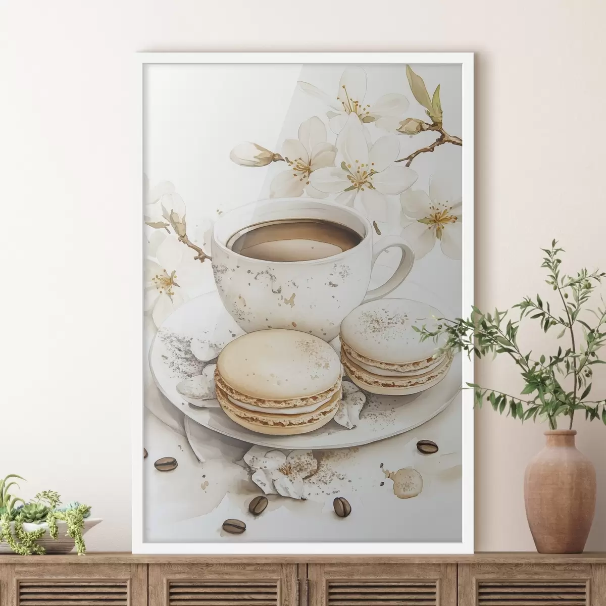 Poster Taza de café con macarrones, estilo acuarela, colores suaves, flores de jazmín Nr f41949