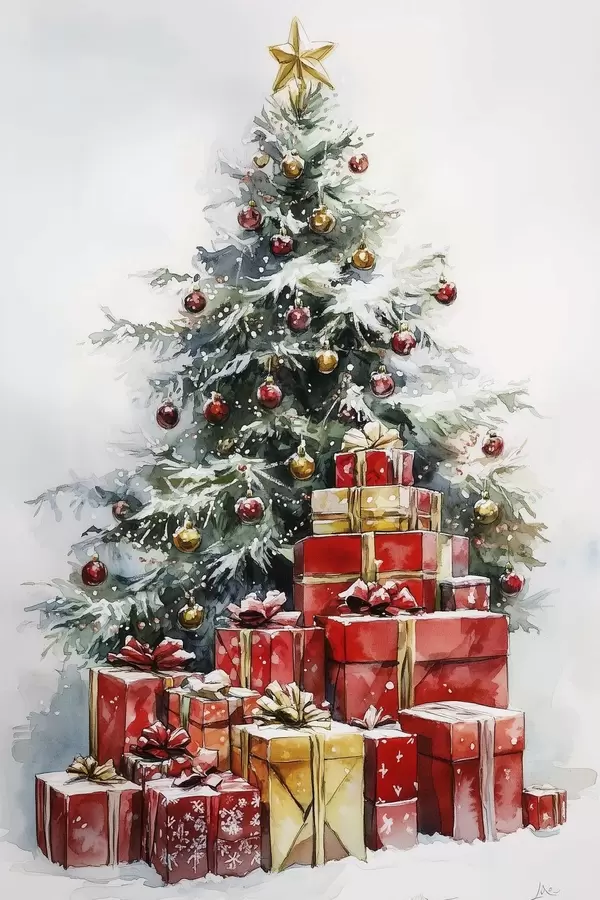 Poster Árbol de navidad festivo con regalos envueltos, nieve, estilo acuarela f41953