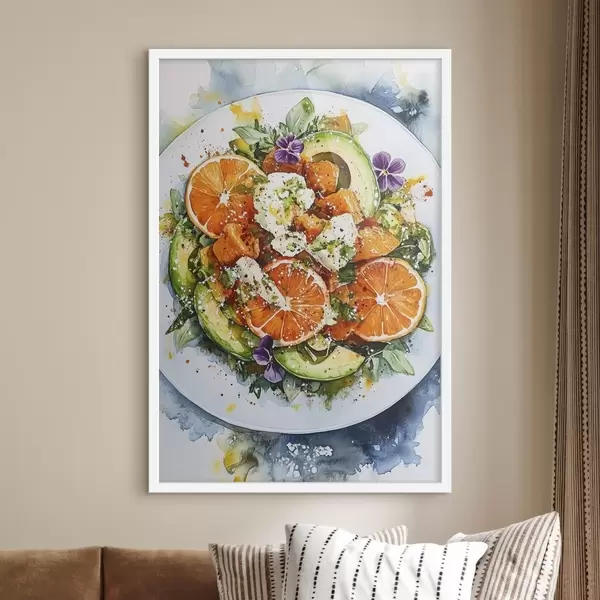 Poster Deliciosa ensalada con naranjas, queso feta, calabazas y aguacate, comida de acuarela Nr f41959