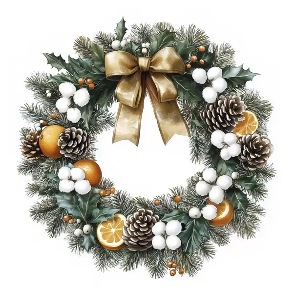 Poster Corona navideña de pino con lazo, algodón, naranjas, bayas y piñas Nr f41962