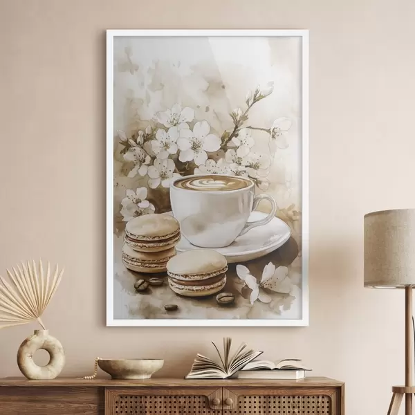 Poster Macarrones, taza de café, estilo acuarela, colores beige, flores de jazmín Nr f41965