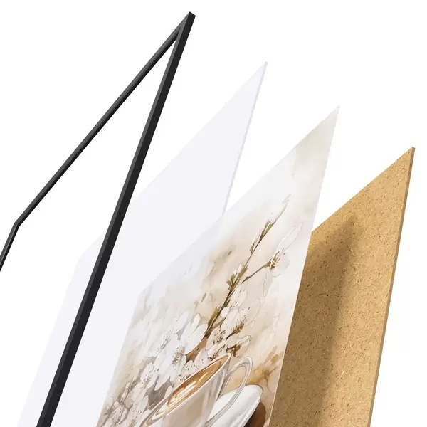 El póster consta de marco, plexiglás, imagen impresa y soporte de aglomerado. El póster puede colgarse inmediatamente en la pared gracias a los soportes de la parte posterior.
