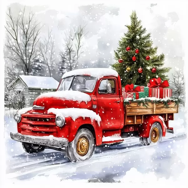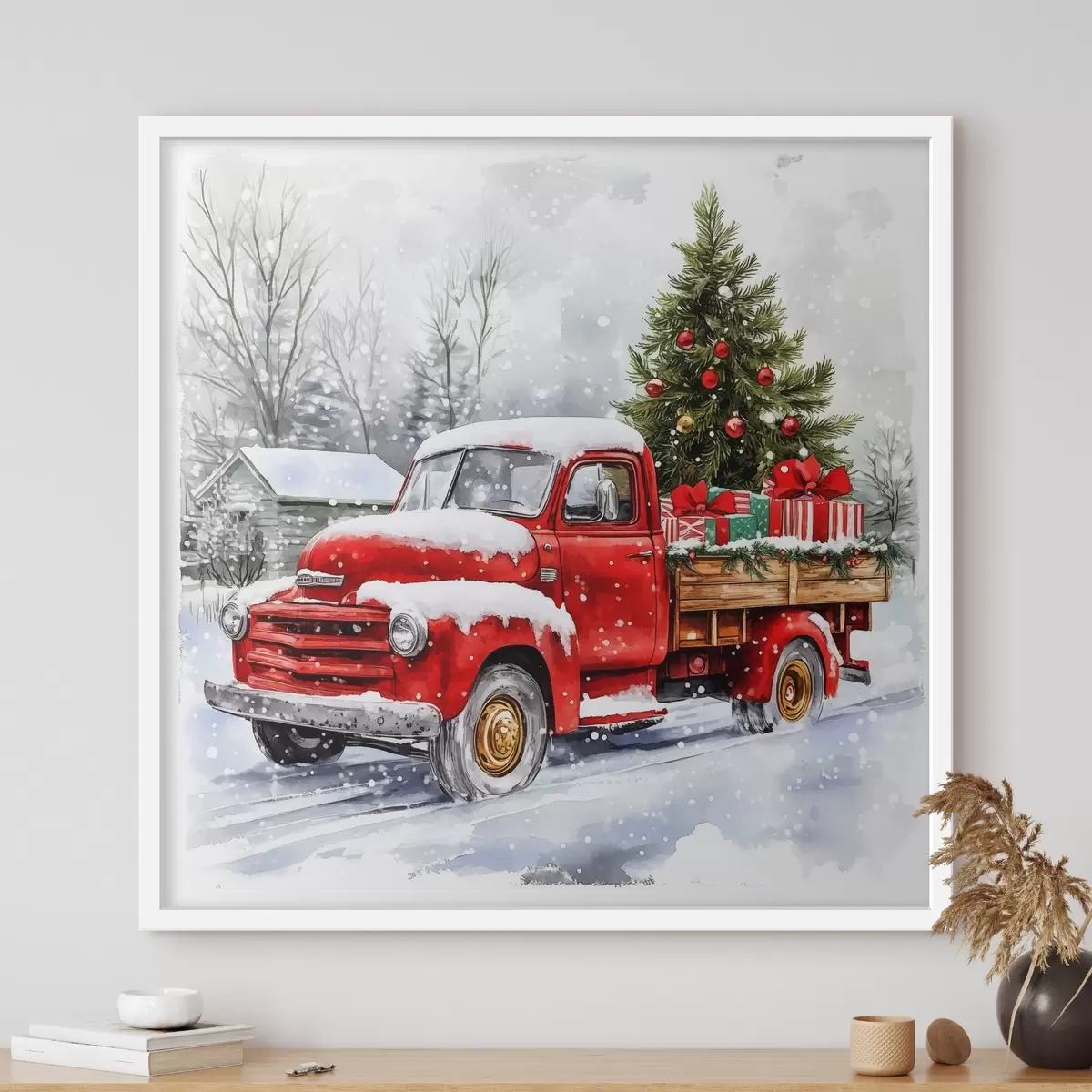 Poster Un coche de Navidad con un árbol y regalos en tiempo de nieve Nr f41968