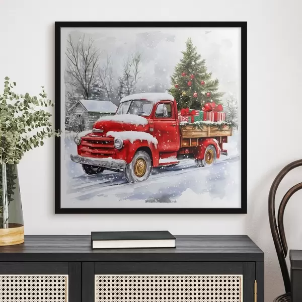 Poster Un coche de Navidad con un árbol y regalos en tiempo de nieve f41968