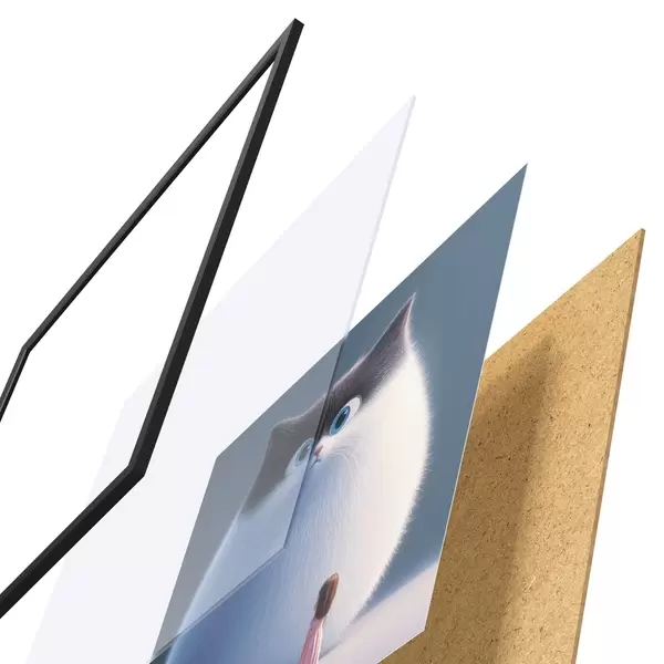 El póster consta de marco, plexiglás, imagen impresa y soporte de aglomerado. El póster puede colgarse inmediatamente en la pared gracias a los soportes de la parte posterior.