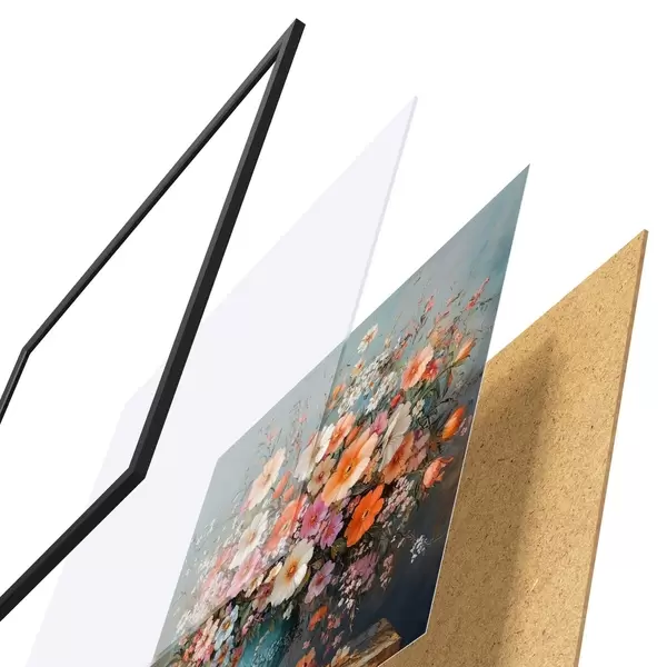 El póster consta de marco, plexiglás, imagen impresa y soporte de aglomerado. El póster puede colgarse inmediatamente en la pared gracias a los soportes de la parte posterior.