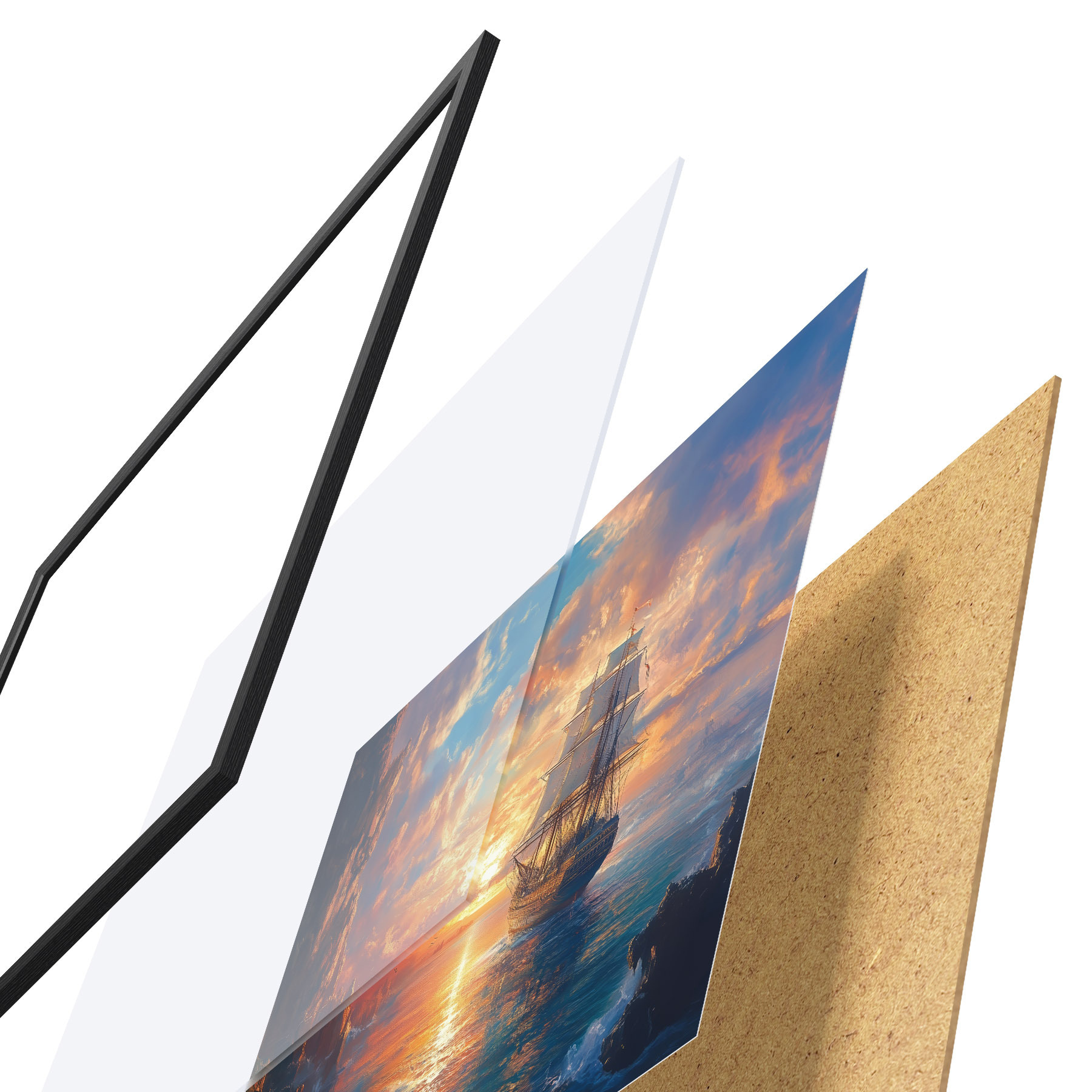 El póster consta de marco, plexiglás, imagen impresa y soporte de aglomerado. El póster puede colgarse inmediatamente en la pared gracias a los soportes de la parte posterior.