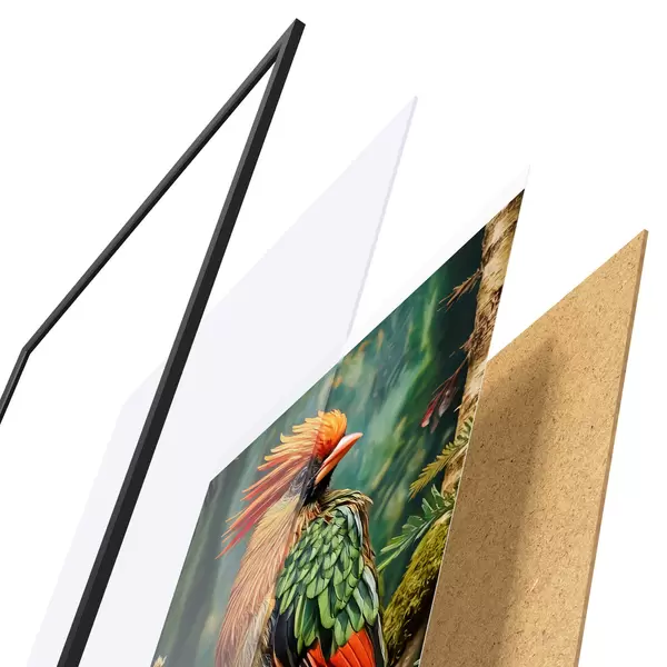 El póster consta de marco, plexiglás, imagen impresa y soporte de aglomerado. El póster puede colgarse inmediatamente en la pared gracias a los soportes de la parte posterior.