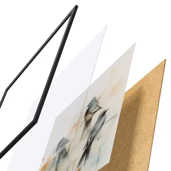 El póster consta de marco, plexiglás, imagen impresa y soporte de aglomerado. El póster puede colgarse inmediatamente en la pared gracias a los soportes de la parte posterior.