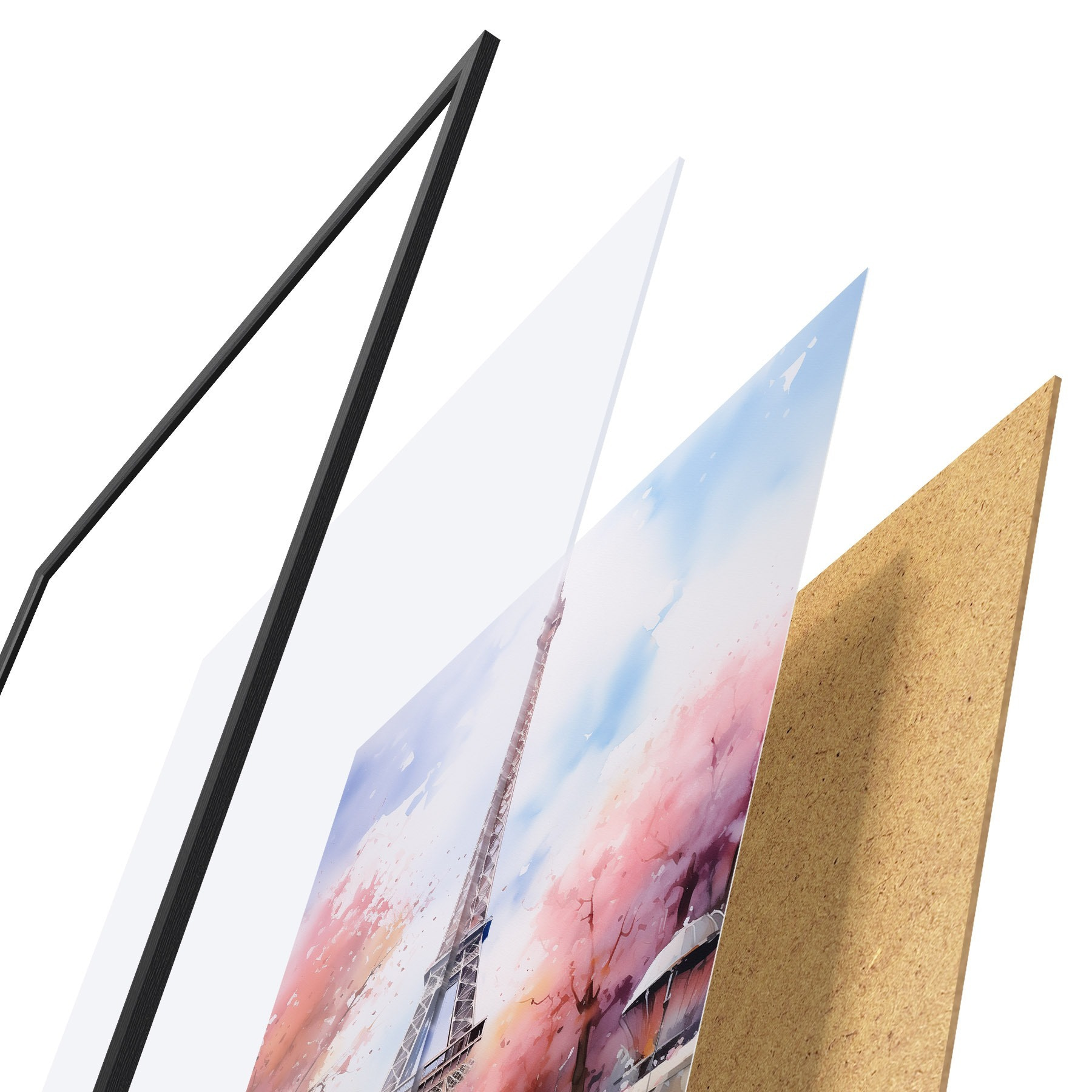 El póster consta de marco, plexiglás, imagen impresa y soporte de aglomerado. El póster puede colgarse inmediatamente en la pared gracias a los soportes de la parte posterior.