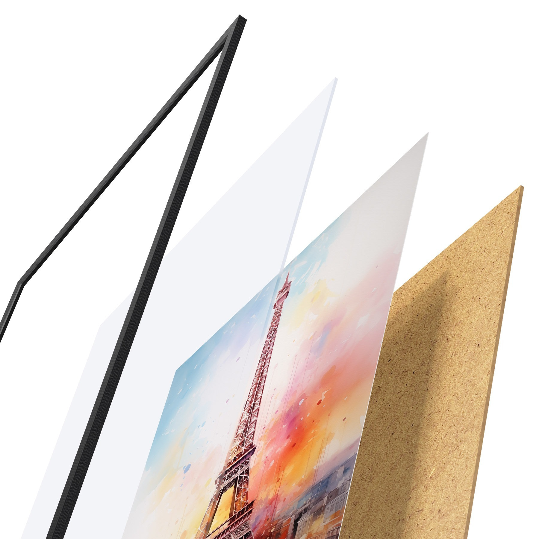 El póster consta de marco, plexiglás, imagen impresa y soporte de aglomerado. El póster puede colgarse inmediatamente en la pared gracias a los soportes de la parte posterior.