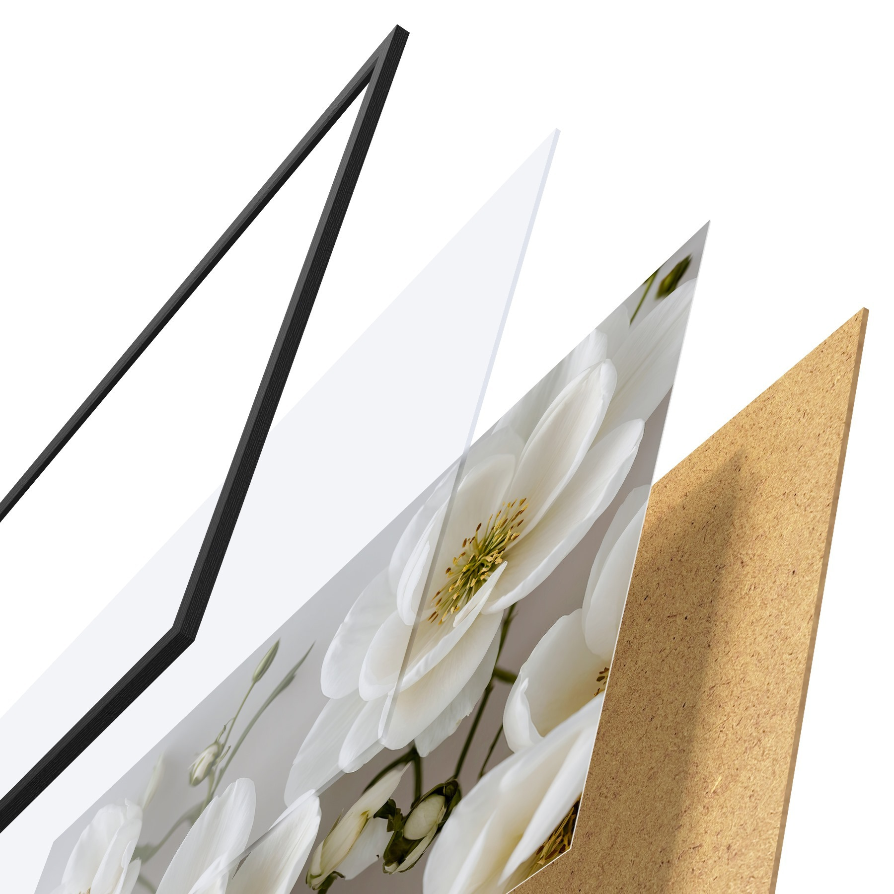 El póster consta de marco, plexiglás, imagen impresa y soporte de aglomerado. El póster puede colgarse inmediatamente en la pared gracias a los soportes de la parte posterior.