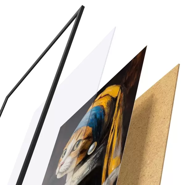 El póster consta de marco, plexiglás, imagen impresa y soporte de aglomerado. El póster puede colgarse inmediatamente en la pared gracias a los soportes de la parte posterior.