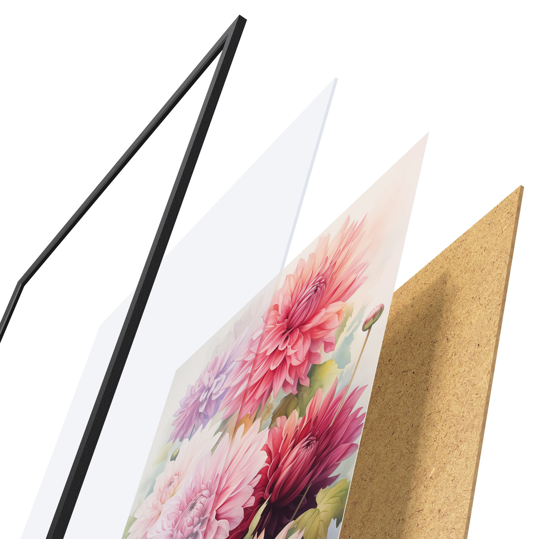 El póster consta de marco, plexiglás, imagen impresa y soporte de aglomerado. El póster puede colgarse inmediatamente en la pared gracias a los soportes de la parte posterior.