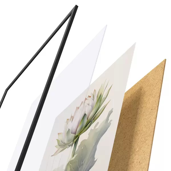 El póster consta de marco, plexiglás, imagen impresa y soporte de aglomerado. El póster puede colgarse inmediatamente en la pared gracias a los soportes de la parte posterior.