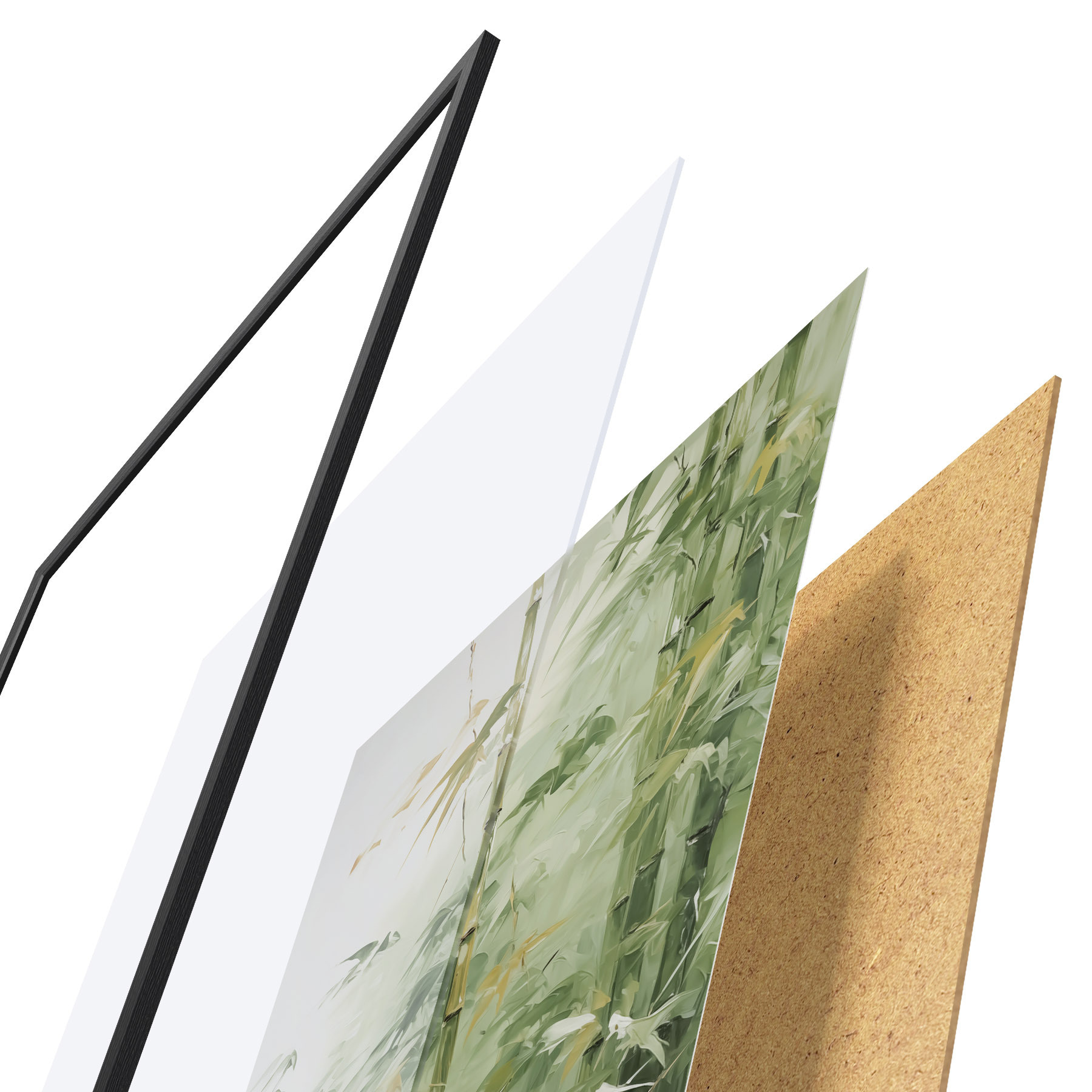 El póster consta de marco, plexiglás, imagen impresa y soporte de aglomerado. El póster puede colgarse inmediatamente en la pared gracias a los soportes de la parte posterior.