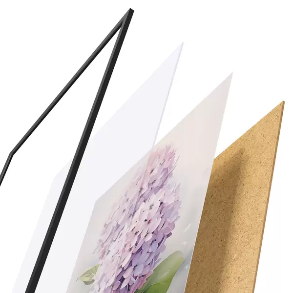 El póster consta de marco, plexiglás, imagen impresa y soporte de aglomerado. El póster puede colgarse inmediatamente en la pared gracias a los soportes de la parte posterior.