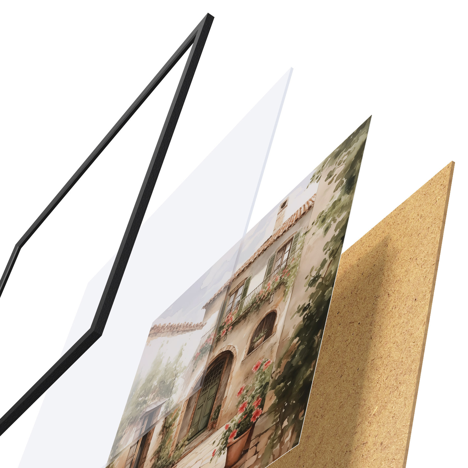 El póster consta de marco, plexiglás, imagen impresa y soporte de aglomerado. El póster puede colgarse inmediatamente en la pared gracias a los soportes de la parte posterior.