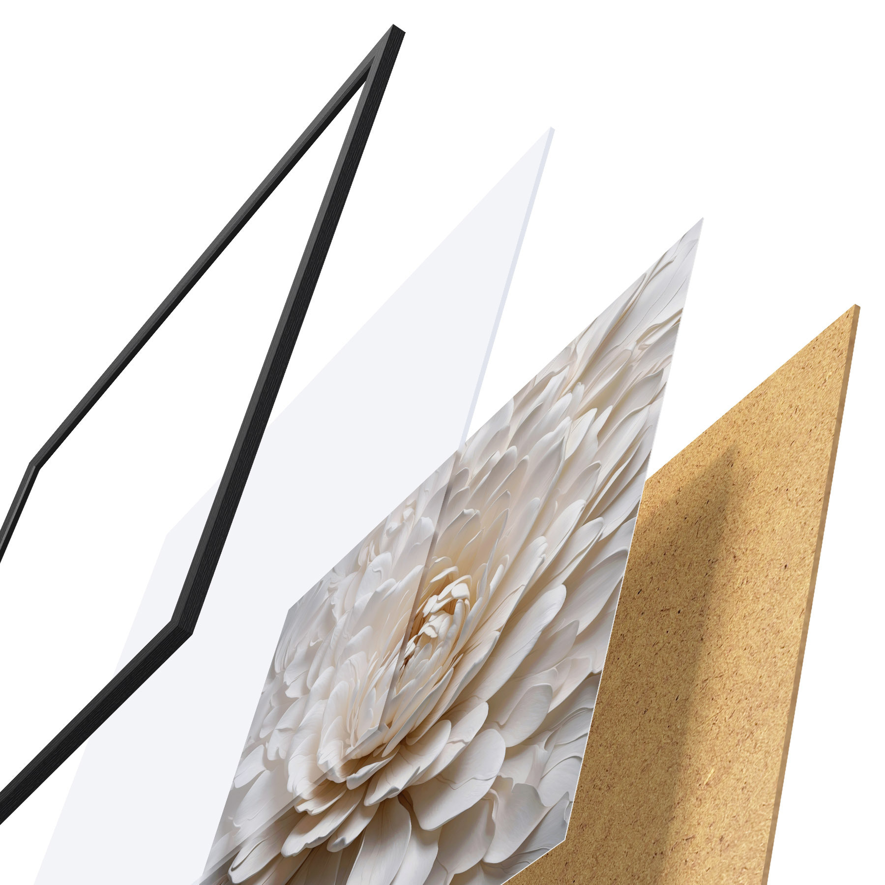 El póster consta de marco, plexiglás, imagen impresa y soporte de aglomerado. El póster puede colgarse inmediatamente en la pared gracias a los soportes de la parte posterior.