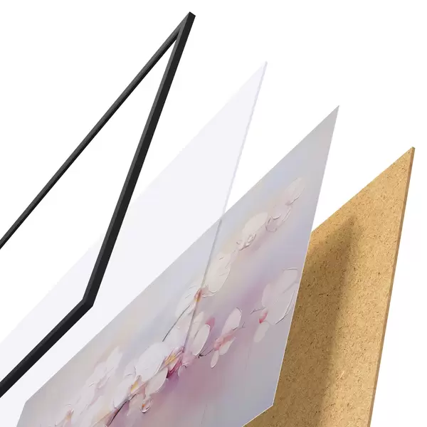 El póster consta de marco, plexiglás, imagen impresa y soporte de aglomerado. El póster puede colgarse inmediatamente en la pared gracias a los soportes de la parte posterior.