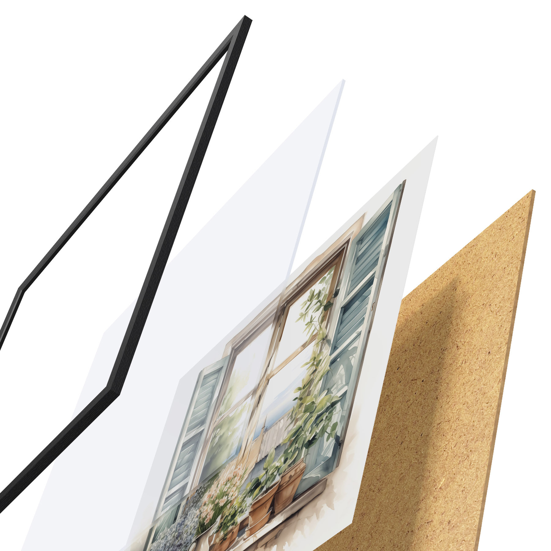 El póster consta de marco, plexiglás, imagen impresa y soporte de aglomerado. El póster puede colgarse inmediatamente en la pared gracias a los soportes de la parte posterior.