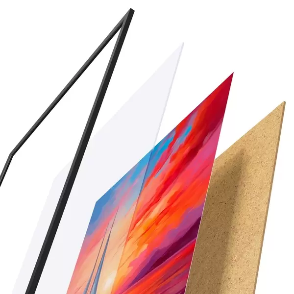 El póster consta de marco, plexiglás, imagen impresa y soporte de aglomerado. El póster puede colgarse inmediatamente en la pared gracias a los soportes de la parte posterior.