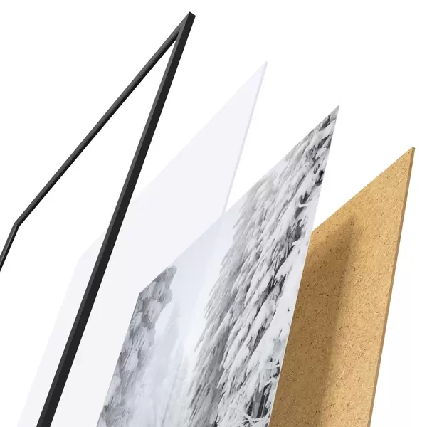 El póster consta de marco, plexiglás, imagen impresa y soporte de aglomerado. El póster puede colgarse inmediatamente en la pared gracias a los soportes de la parte posterior.