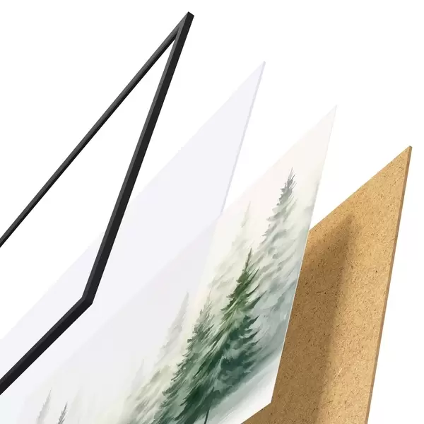 El póster consta de marco, plexiglás, imagen impresa y soporte de aglomerado. El póster puede colgarse inmediatamente en la pared gracias a los soportes de la parte posterior.