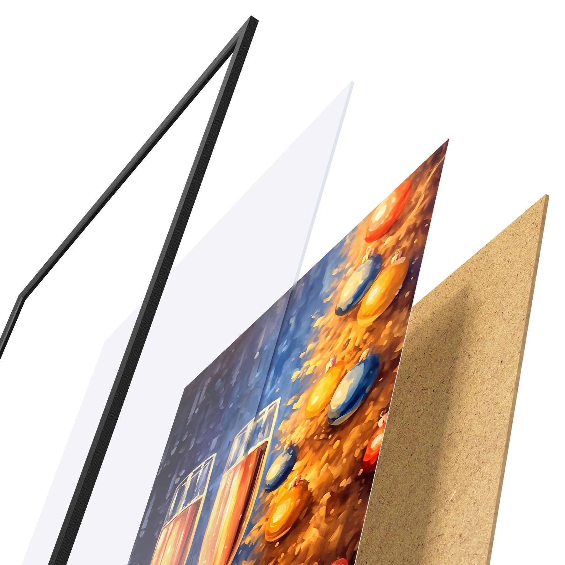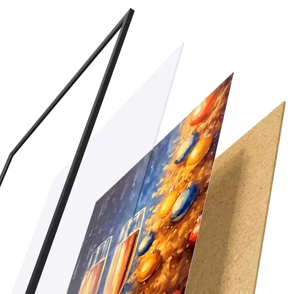 El póster consta de marco, plexiglás, imagen impresa y soporte de aglomerado. El póster puede colgarse inmediatamente en la pared gracias a los soportes de la parte posterior.