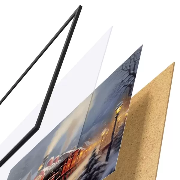 El póster consta de marco, plexiglás, imagen impresa y soporte de aglomerado. El póster puede colgarse inmediatamente en la pared gracias a los soportes de la parte posterior.