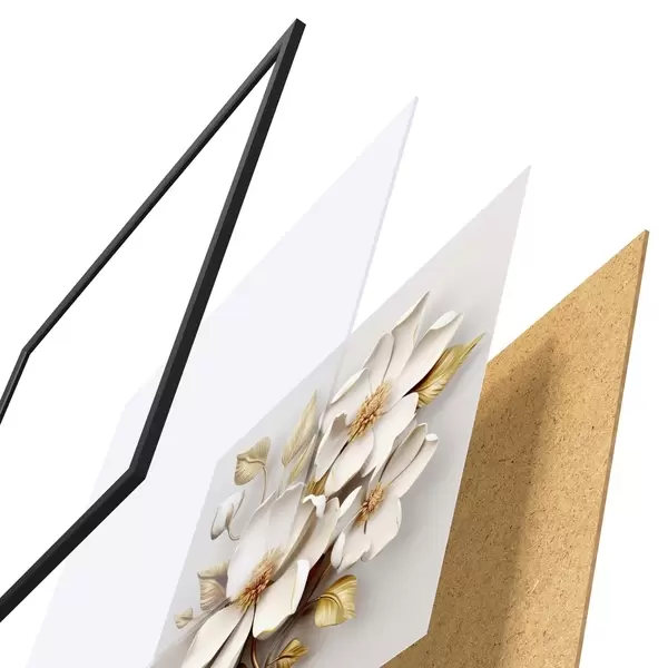 El póster consta de marco, plexiglás, imagen impresa y soporte de aglomerado. El póster puede colgarse inmediatamente en la pared gracias a los soportes de la parte posterior.