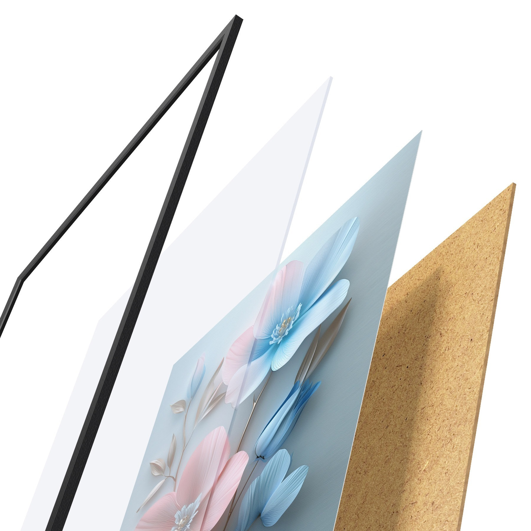 El póster consta de marco, plexiglás, imagen impresa y soporte de aglomerado. El póster puede colgarse inmediatamente en la pared gracias a los soportes de la parte posterior.