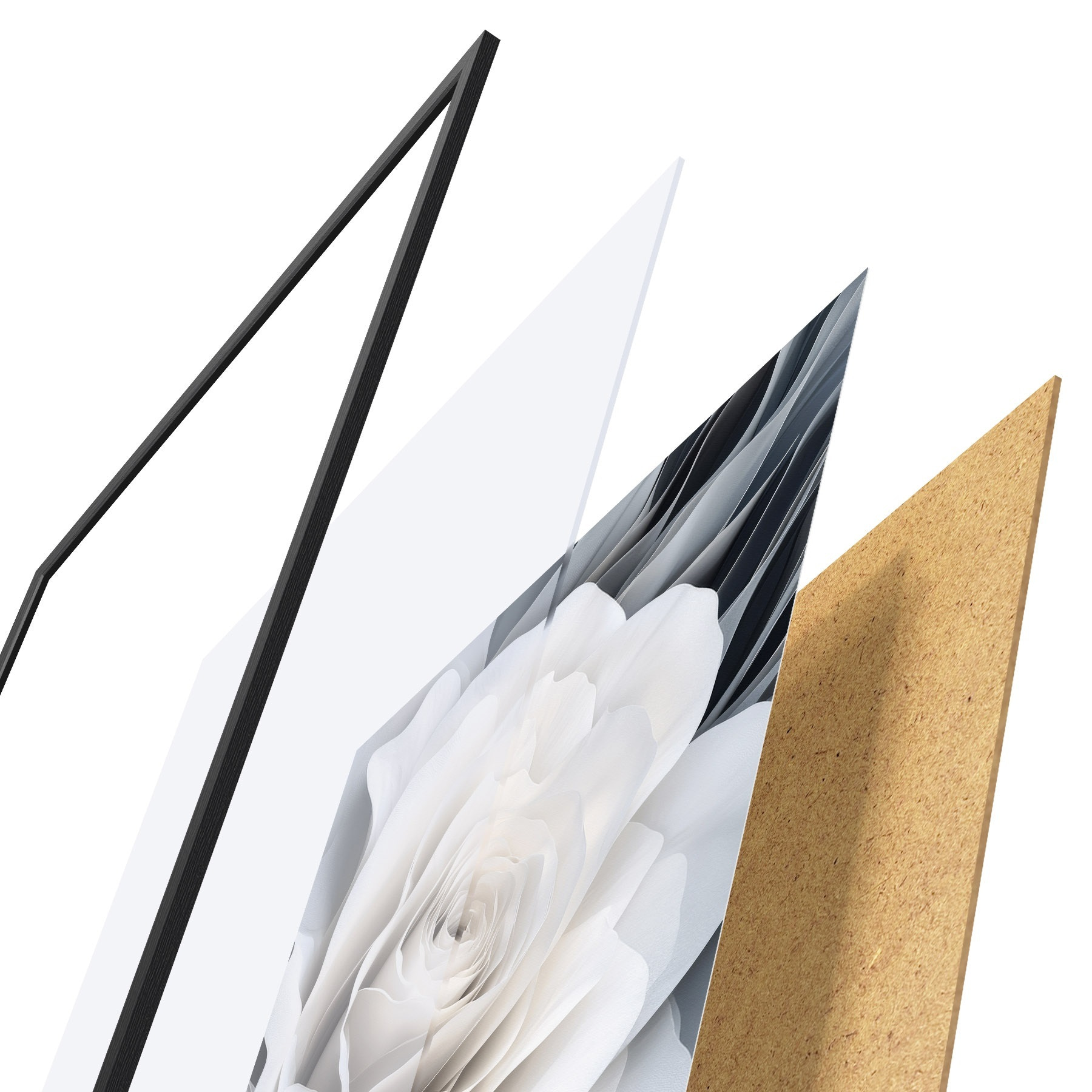 El póster consta de marco, plexiglás, imagen impresa y soporte de aglomerado. El póster puede colgarse inmediatamente en la pared gracias a los soportes de la parte posterior.