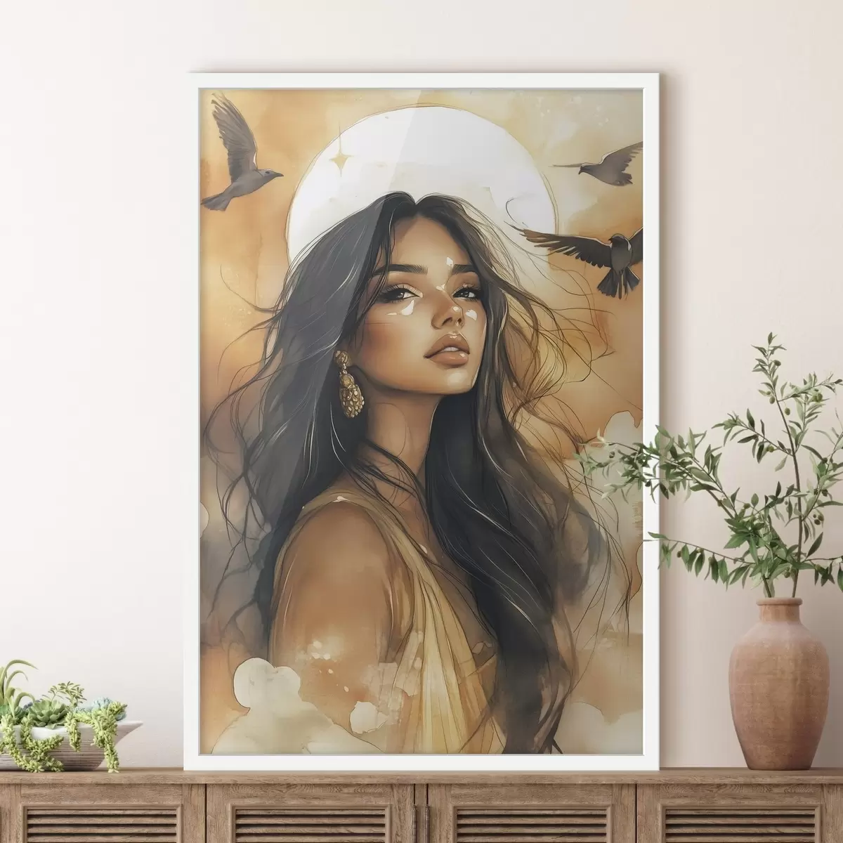 Poster Mujer con pájaros volando, tribal, colores beige, sol Nr f42196