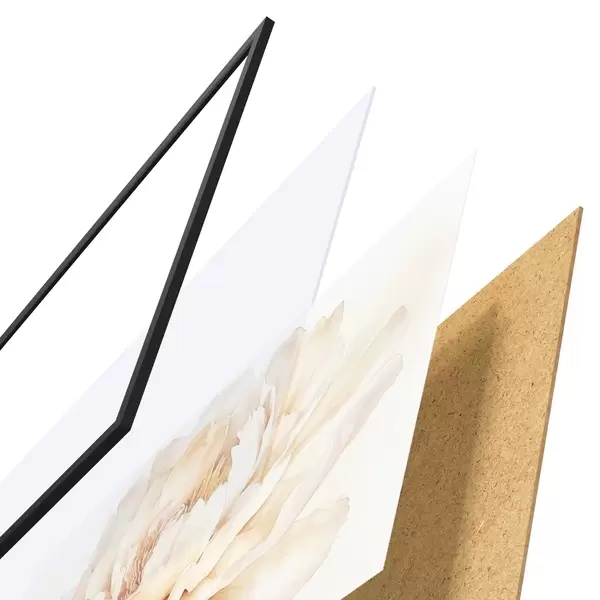 El póster consta de marco, plexiglás, imagen impresa y soporte de aglomerado. El póster puede colgarse inmediatamente en la pared gracias a los soportes de la parte posterior.