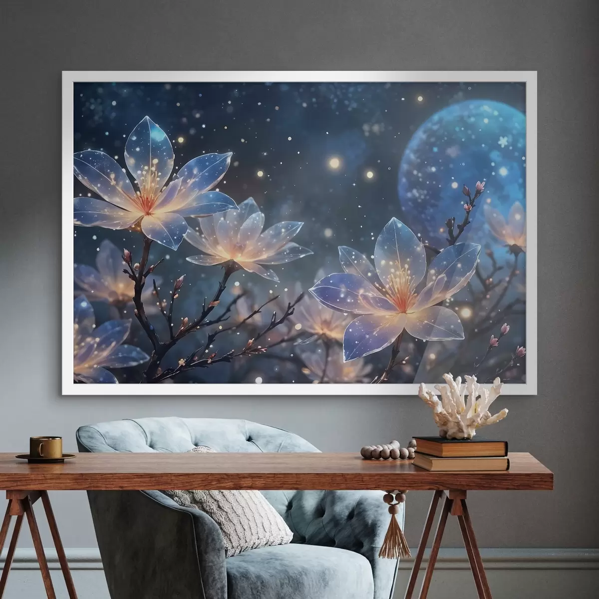 Poster Abstracto flores de fantasía en las ramas con pétalos de textura con las estrellas y una luna en un cielo nocturno de fondo Nr f42211