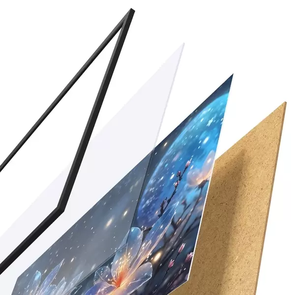 El póster consta de marco, plexiglás, imagen impresa y soporte de aglomerado. El póster puede colgarse inmediatamente en la pared gracias a los soportes de la parte posterior.