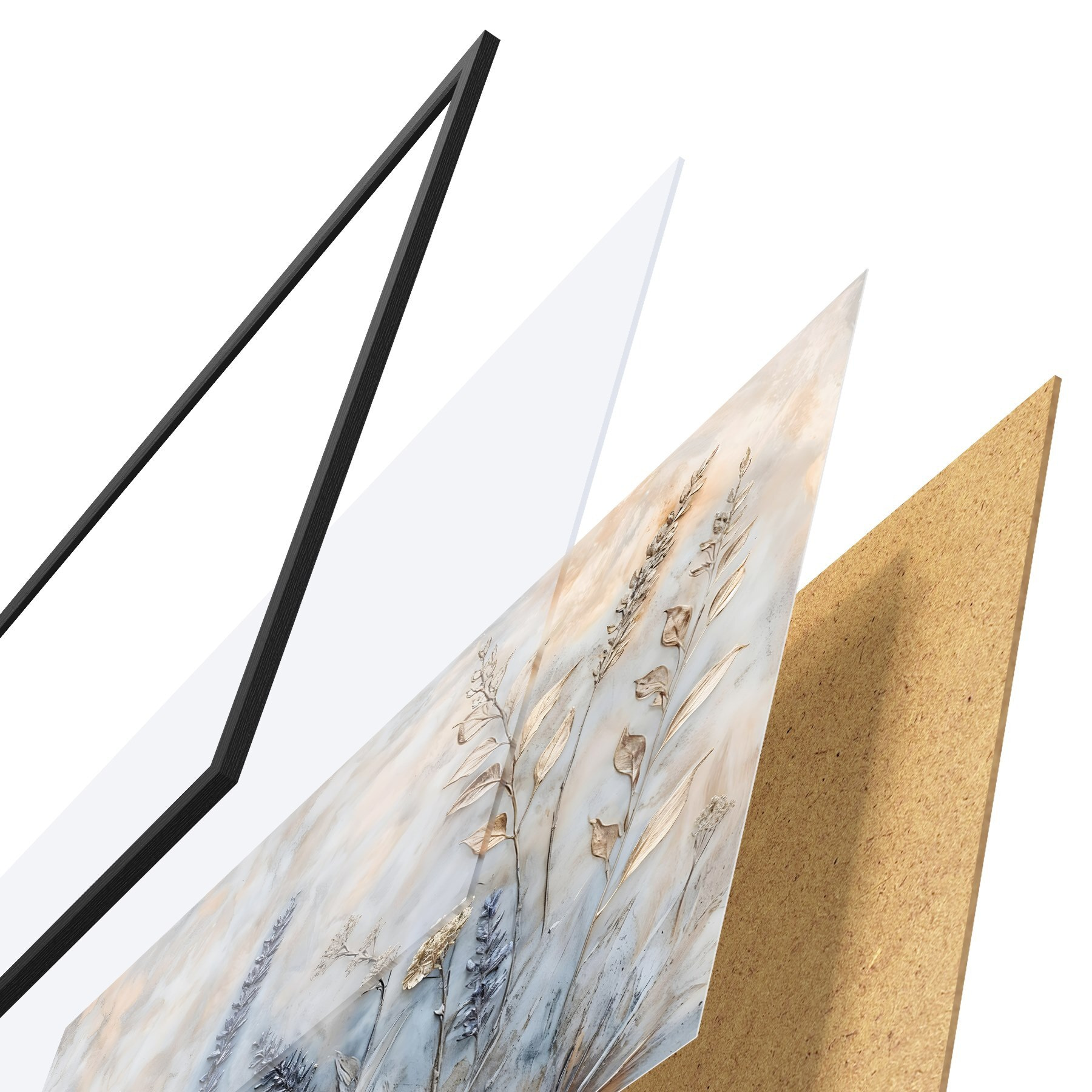 El póster consta de marco, plexiglás, imagen impresa y soporte de aglomerado. El póster puede colgarse inmediatamente en la pared gracias a los soportes de la parte posterior.