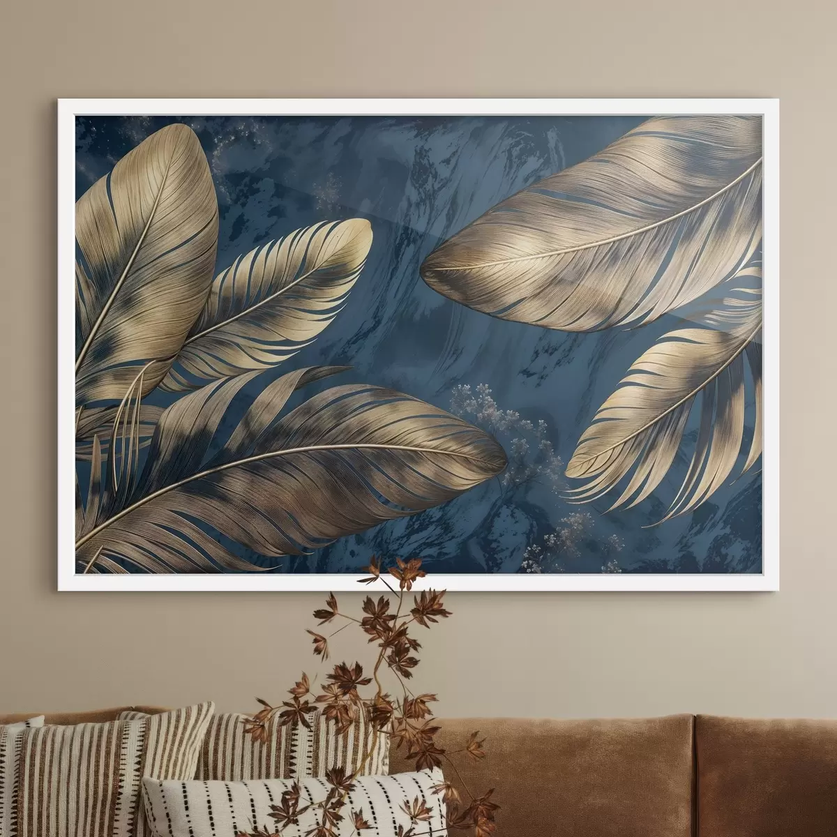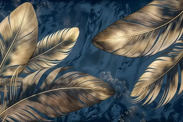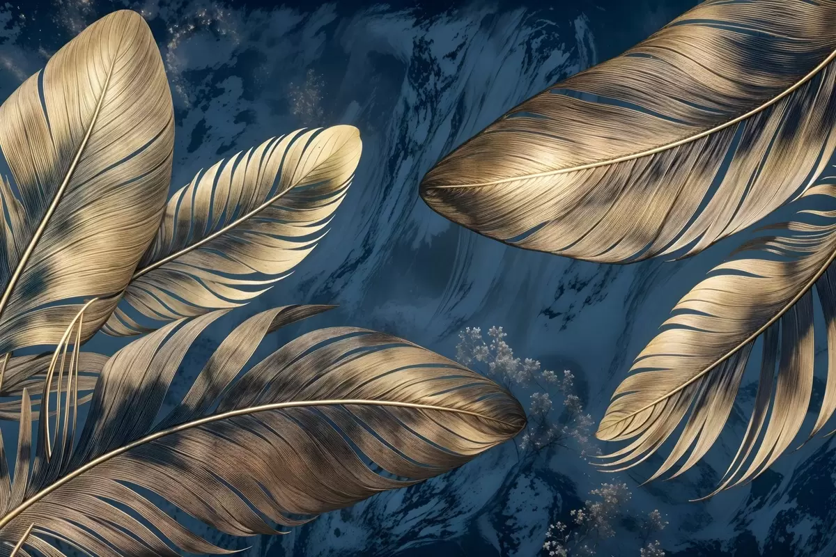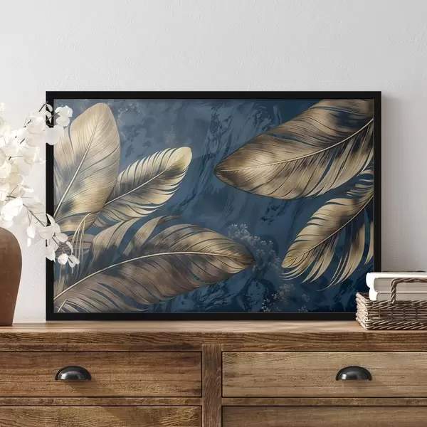 Poster Plumas decorativas abstractas de color amarillo y beige flotando sobre un fondo de textura azul oscuro f42218