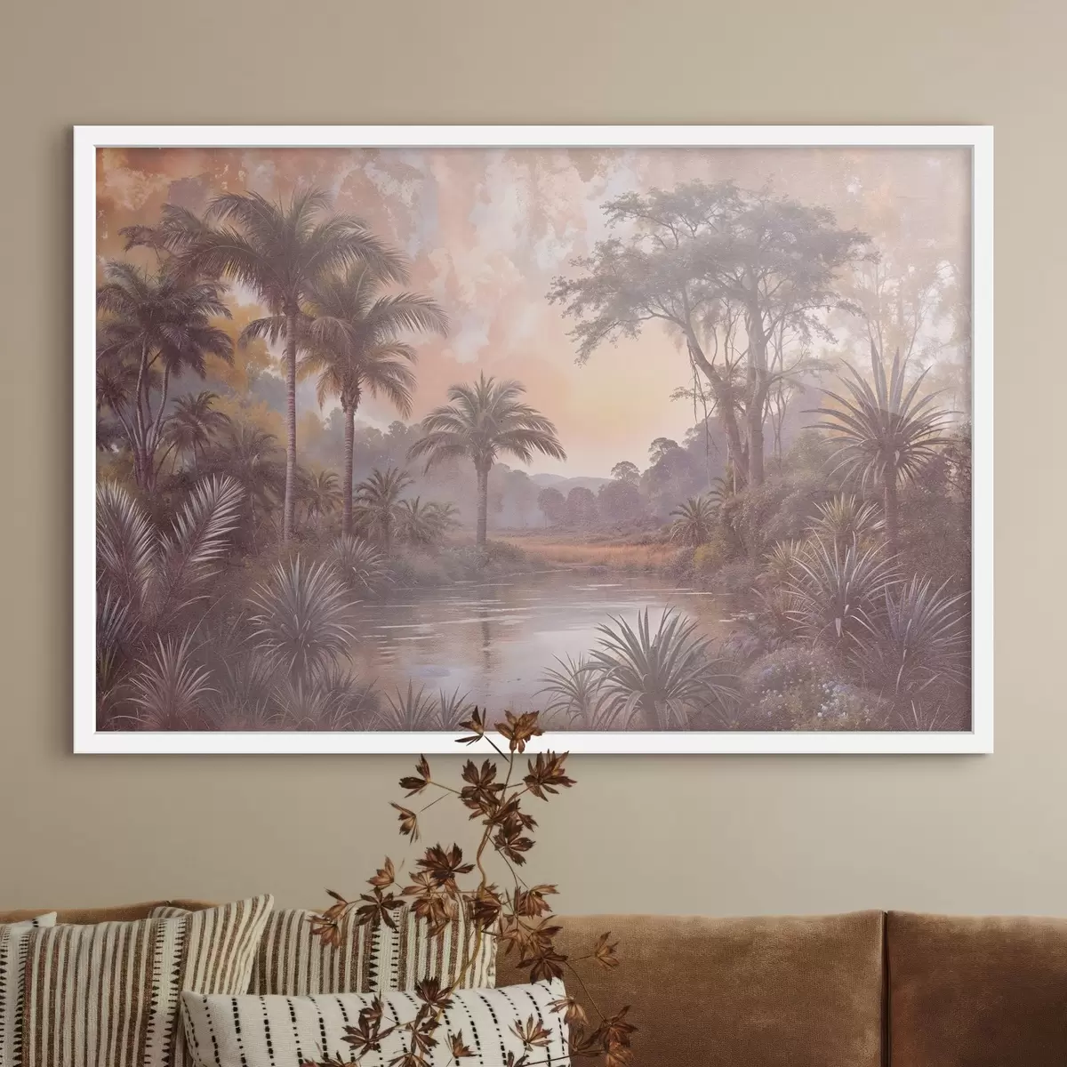 Poster Un paisaje de textura tropical con un lago sereno rodeado de exuberantes palmeras y otros follajes Nr f42219